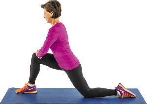 Estiramiento de flexores de cadera de rodillas: Arrodíllese. Coloque la pierna derecha delante de usted, con la rodilla doblada en un ángulo de 90° y el pie derecho apoyado en el suelo. Coloque las manos sobre el muslo derecho, inclínese hacia delante y presione la cadera izquierda hacia delante mientras mantiene el pie derecho en el suelo. Sienta el estiramiento en la parte delantera del muslo y la cadera izquierdos. Aguante y vuelva a la posición inicial. Repita con la pierna izquierda hacia delante.