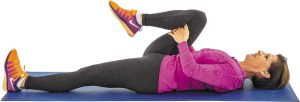 Tirón con una sola rodilla: Túmbate boca arriba con las piernas extendidas. Dobla la rodilla derecha. Sujete la parte posterior del muslo y tire de la rodilla hacia el pecho hasta que sienta el estiramiento en la parte baja de la espalda y el glúteo derecho.